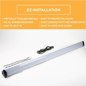 | What Makes it EZ? | Virtually Tooless install; No AC wiring required, just plug it in; Easy to mount via chain; Easy connectivity between units; Easy to wipe and clean; |