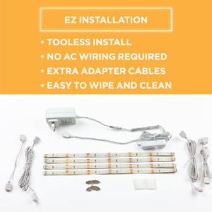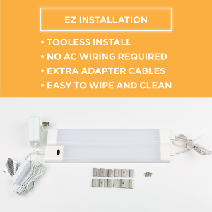 | What Makes it EZ? | Tooless install; No AC wiring required, just plug it in; Easy hand motion On/Off; Easy connectivity between units; Easy to position with extra adapter cables; Easy to wipe and clean; |